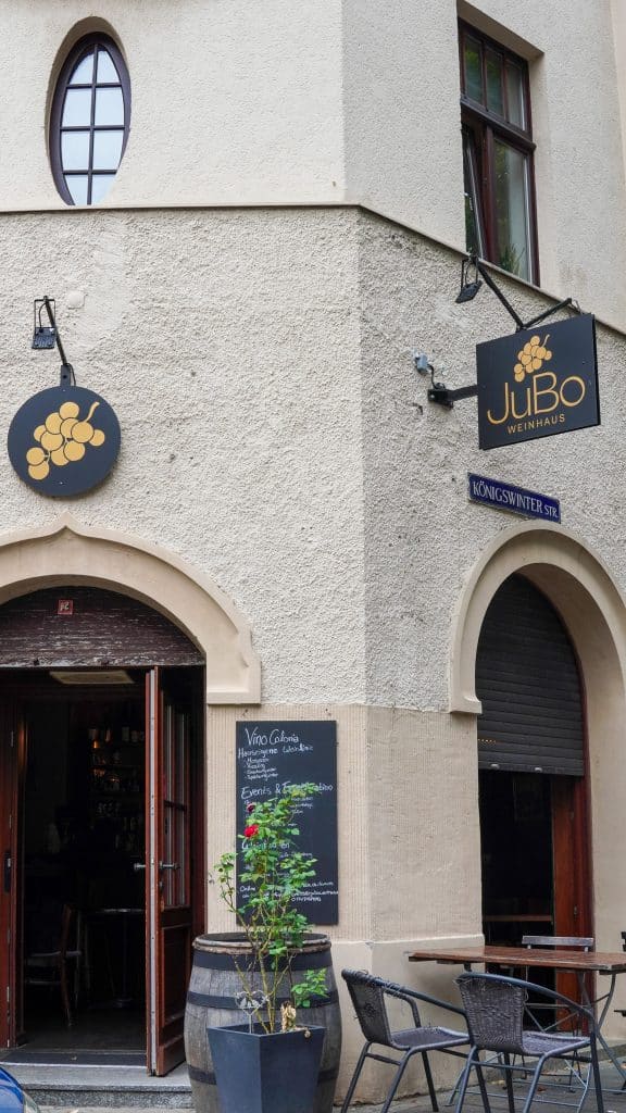 Nicht weit entfernt vom Gürtel, aber dennoch in einer entspannten und ruhigen Gegend von Sülz liegt die Gaststätte „JuBo-Weinhaus“. Der etwas ungewöhnliche Name ist schnell erklärt, denn die Inhaber Julia und Boris haben sich mit der Eröffnung eines eigenen Lokals einen Traum erfüllt, das eine prächtige Ergänzung zu ihrem anderen beruflichen Engagement ist – der Organisation von Weinreisen in deutsche und europäische Weingebiete. Ihre Liebe zu Köln verbindet die beiden ebenfalls und hat letztlich in der Kreation eines eigenen Weins, den „Vino Colonia“, geführt, der als Grauburgunder, Mosecco oder Riesling gereicht wird und mit einem besonderen Etikett daherkommt.
