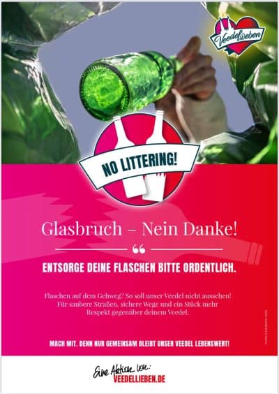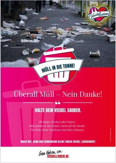 Während das Motiv „Überall Müll – Nein danke!“ zur aktiven Müllvermeidung aufruft, um das eigene Veedel für die Nachbarn und das eigene Zuhause sauber zu halten, appelliert das Plakat „Überall Glasbruch – Nein danke!“ an die Eigenverantwortung der Kölner, aufmerksamer für saubere Wege zu sorgen und somit dem Veedel mehr Achtung zu zollen. „Ein Veedel ist wie ein Wohnzimmer. Man schmeißt ja auch keinen Müll auf den eigenen Teppich. Sauberkeit beginnt mit Respekt vor sich selbst, vor den Nachbarn und vor unserer Stadt“, erläutert Hans-Günter Grawe, Geschäftsführer und Handelskümmerer, den Hintergrund der Aktion. Schließlich möchte der Aushang „Lokal kaufen – Ja bitte!“ die Anwohner animieren, mögliche Anschaffungen bei lokalen Gewerbetreibenden zu tätigen respektive Veedelfeste durch dortigen Konsum zu stärken und auf die Mitnahme externer Speisen und Getränke zu verzichten.